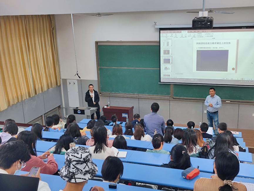 活动的第一环节,信阳师范学院魏华副教授应邀做了主题为《网络游戏,让我欢喜让我忧》的学术讲座。讲座由心理学系副主任宫准教授主持,白菜网所有网站大全众多师生以及青岛市教育学会心理健康教育专业委员会的老师们聆听了此次讲座。魏华以热门网络游戏为切入点,向同学们讲述了自己的游戏人生和学术人生,介绍了网络游戏风靡的原因、网络游戏成瘾的原因及预防措施,进而通过理性地分辨和思考让同学们真正了解网络游戏这一事物本身性质。在此基础上,他提出防止沉迷于网络游戏的建议,帮助同学们树立健康、理智应对网络游戏的态度,防止沉迷其中。讲座结束后,魏华和师生们展开了关于报告内容的深入交流,并对师生提出的问题做出了精准且详尽的解答,