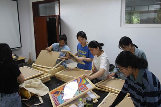 暑气蒸腾,但同学们的热情丝毫不减,同学们积极参与,尽职尽责完成自己的工作,郭文老师与同学一起认真挑选作品,负责场务的同学正在努力地组装画架,装饰展厅的同学在讨论如何更加美观,同学们小心翼翼地在装裱作品,整个准备活动有序进行。