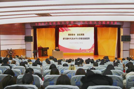 宣讲会上,胡金焱对党代会确定的“进入国家‘双一流’建设行列,建成国内外有较大影响的一流大学”的总体目标、三步走发展战略、“五大发展理念”、“五个战略重点”和实现发展的“十大建设工程”做了详细解读。对学院建设提出了七点要求:一是要切实加强党的基层建设,为学院的发展定向护航。二是要深刻理解内涵发展、特色发展和创新发展理念,牢固树立师生为本、育人为本的教育价值导向,尊重和发挥师生办学主体作用。三是要转变人才培养理念、提高教师教书育人能力,大力开展创新创业教育,提升人才培养质量。四是要提升承担重大科研任务的能力,激发学术平台的创新活力,全面提升科学研究和学术创新的整体水平。五是要加强高层次人才引进和培养工作,提高管理水平,建立人才队伍支撑、激发干事创业活力。六是要立足青岛、融入青岛、服务青岛,服务山东新旧动能转换。七是要在人才队伍、人才培养、学术研究上实施国际化开放办学工程。