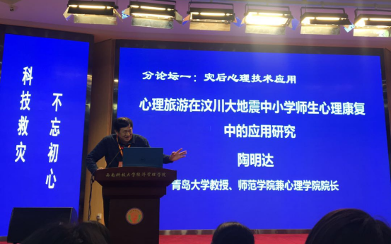 陶明达教授应邀作了题为《心理旅游在汶川大地震中小学生心理康复中的应用研究》的主题报告。主要介绍了心理旅游的相关概念,包括心理旅游的内涵、作用、特点、主要表现形式,以及心理旅游涉及的理论、方法与操作流程。重点介绍了运用心理旅游的理论与方法在汶川大地震中小学师生中实际应用过程和疗效。陶明达教授是我国心理旅游的首创者,他把心理旅游应用在心理干预中,汶川地震后,先后多批次组织了100余名北川师生到青岛进行心理旅游,收到了明显的成效。陶明达对心理旅游对汶川大地震后中小学师生的心理康复作用进行了对比分析、执行研究和效果评估等。此项应用成果进一步完善了“青岛-北川陈家坝、曲山”的心理援助模式,即“以阶段性需求为特征的递进激励式心理援助模式”,促进了灾后心理的重建,赢得了入会专家的好评。