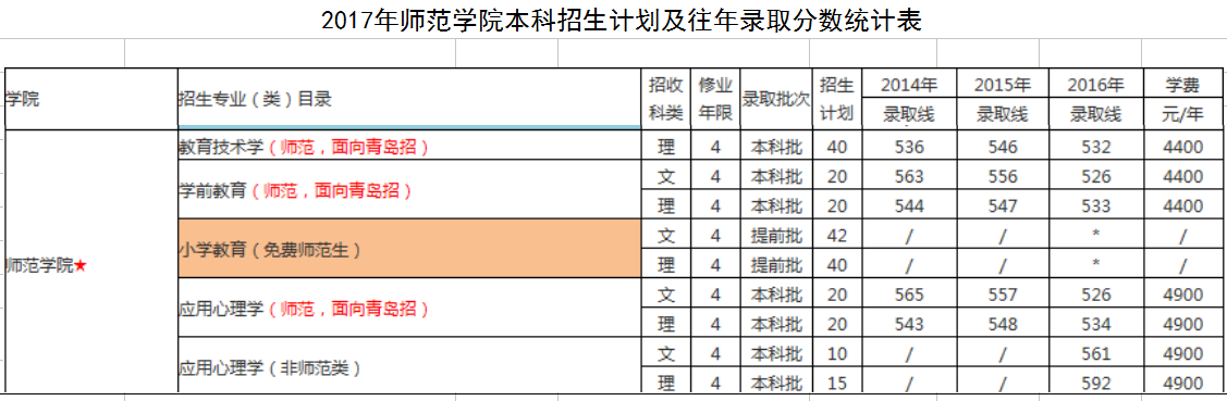 2017年师范学院本科招生计划及往年录取分数统计表