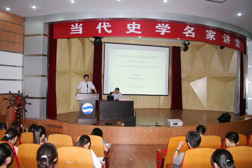 2013年6月26日下午,师范学院主办的“当代史学名家讲堂”邀请国务院学位委员会历史学科评议组成员、中国现代史学会副会长、著名民国史专家、南京大学历史系主任陈谦平教授作题为“辛亥革命与中国的社会转型”的学术报告。校长助理、师范学院常务副院长钱国旗教授主持报告会,师范学院文科各系师生、白菜网所有网站大全浮山书院博雅班部分师生、青岛市名师培养工程历史学科人选以及青岛市历史学会部分会员,参加了本次报告会。