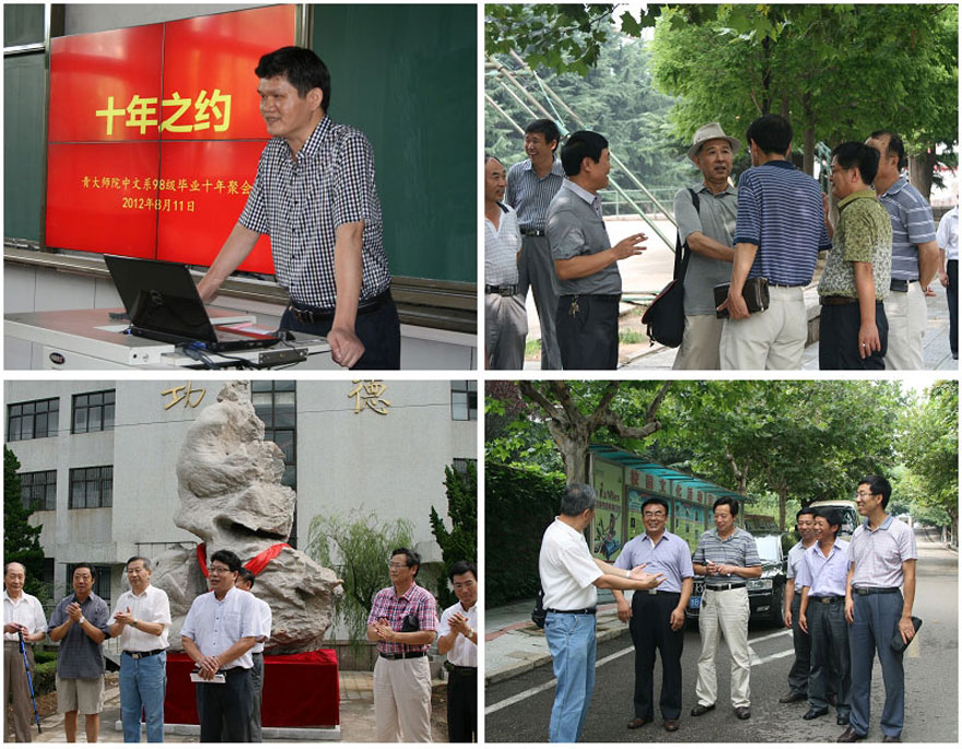 聚会期间,校友们游览了校园风景,再次步入曾经学习生活过的教室、宿舍,体验当年的大学生活,回忆当时度过的美好时光,赞叹几十年学院发生的巨大变化,每个人的脸上都洋溢着幸福自豪的笑容。在师生座谈会上,钱院长等院领导向校友介绍了近几年学院在学科建设、队伍建设、人才培养、办学规模、办学条件等方面的发展情况,展望了学院"十二五改革发展规划"的美好前景,期望广大校友继续关心、支持母校的发展、并为母校的发展壮大推波助力,建言献策。会上,老教师代表也分别致词,表达了对学生的深切关怀和诚挚祝福。随后,校友们争先发言,交流人生体会,表达了对学院、对老师的感恩之情和美好祝愿,并纷纷向母校捐赠,以表达对母校的款款深情。特别是80级化学班校友在教学楼竖立了一座宽4米,高6.5米的太湖风景石,并在办公楼前种植了6株桂花树,为校园增添了一道亮丽的风景。