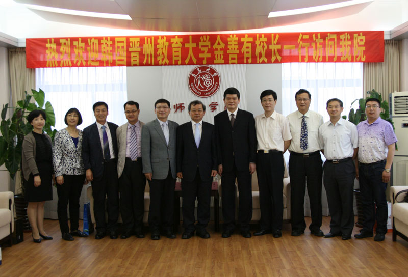 6月14日上午,韩国晋州教育大学金善有校长一行四人访问白菜网所有网站大全。校长助理、师范学院常务副院长钱国旗在三楼接待室会见了金善有一行。师范学院党委副书记李善惠、副院长吴伟民等参加了会见。