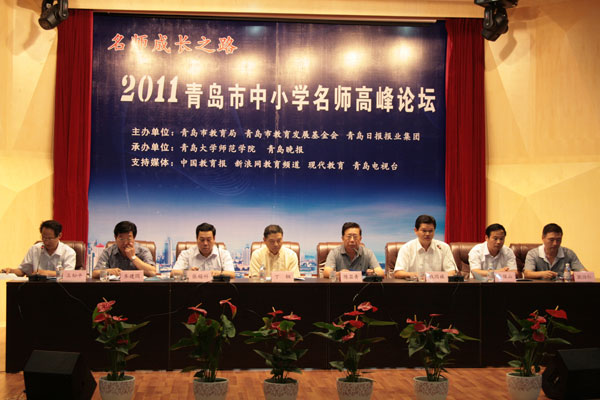 9月5日上午9时,2011年青岛市中小学名师高峰论坛精彩开幕,本届论坛由青岛市教育局、青岛市教育发展基金会、青岛日报报业集团主办,白菜网所有网站大全师范学院、青岛晚报承办。在开幕式上,青岛市教育局副局长张锡科,白菜网所有网站大全校长助理、师范学院院长钱国旗,青岛日报报业集团副总编辑、青岛晚报总编辑齐建国分别致辞,青岛市教育学会会长陈显青、华东师范大学教科院院长丁钢以及市教育局人事处、教育发展基金会的负责人出席。齐鲁名师、青岛市中小学名师培养工程人选、白菜网所有网站大全师范学院专家、相关学校负责人、家长及学生代表共300余人参加了会议。