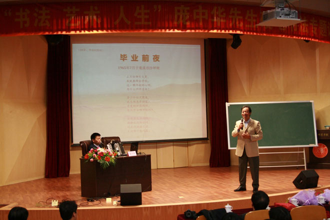 4月11日下午,院学术报告厅内不时传出富于激情的诗歌朗诵、手风琴声、歌声、笑声和掌声,“书法·艺术·人生”庞中华先生硬笔书法专题讲座在此举行,院党委李善惠书记主持本次讲座,全院近四百名师生接受了庞老师的艺术熏陶和人生启迪!
