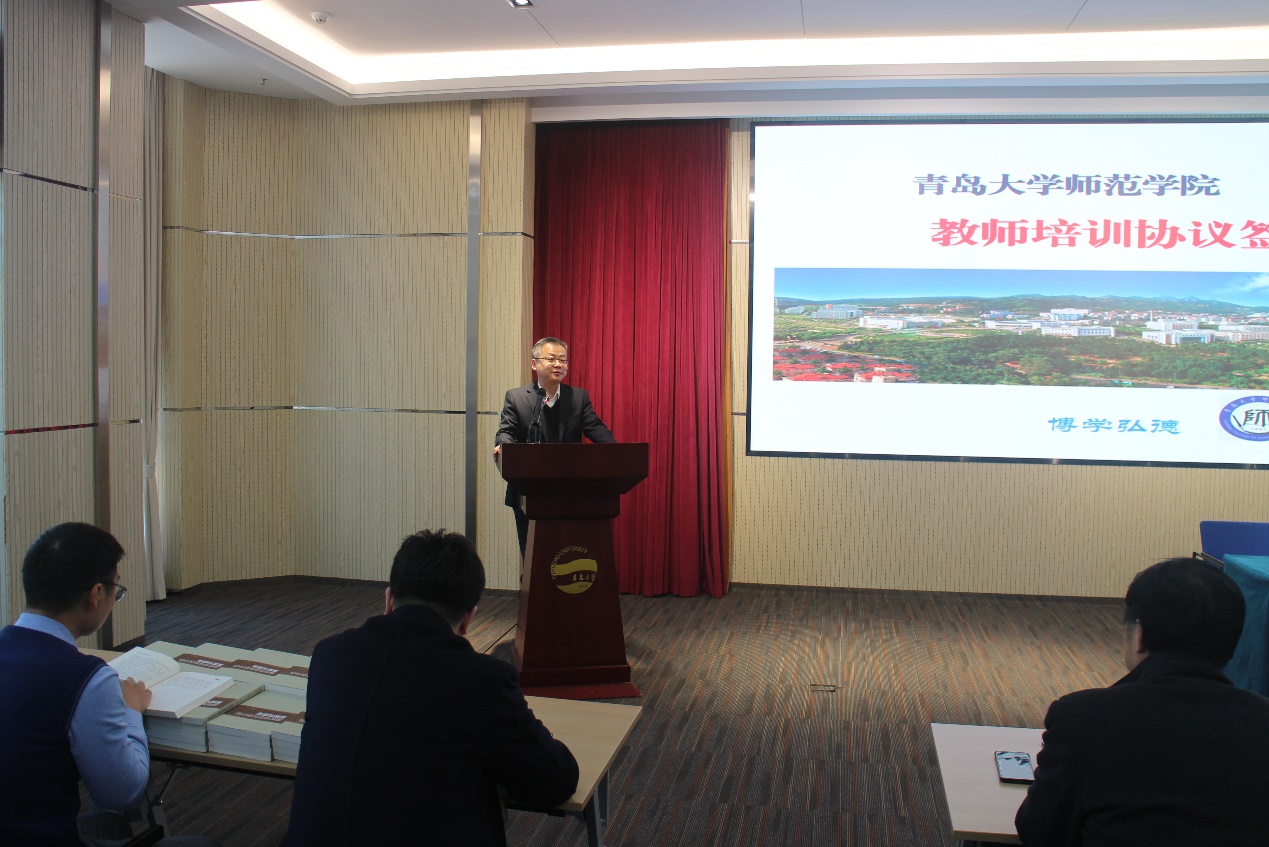 12月26日,师范学院与华青教育集团教师培训协议签约暨开班仪式在白菜网所有网站大全会议中心404室举行。校党委常委、副校长肖江南,华青教育集团党委书记、总经理李蛟龙,学院党委书记宋贵欣,院长孙百才,副院长陶明达、马勇军,华青教育集团的各中小学校长、54位教师学员,学院教师代表出席大会。华青教育集团总校长闫洪全担任大会主持人。