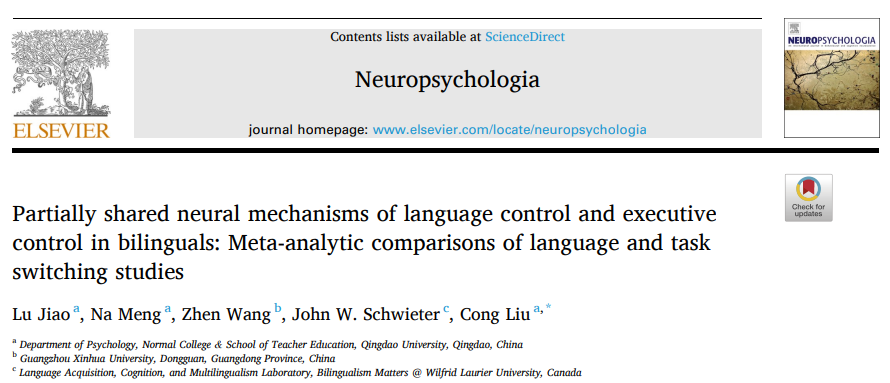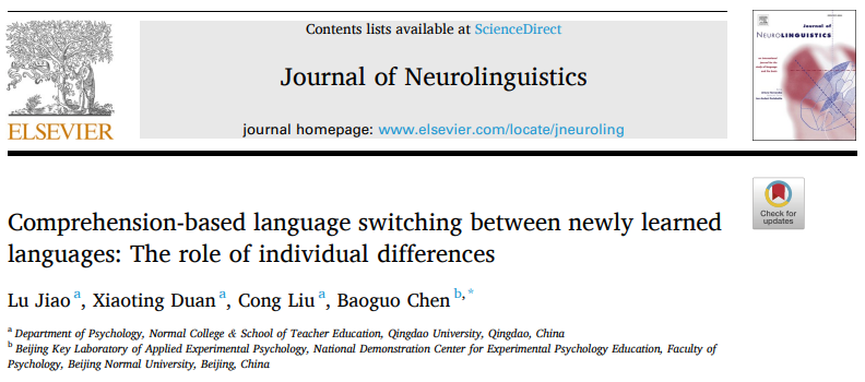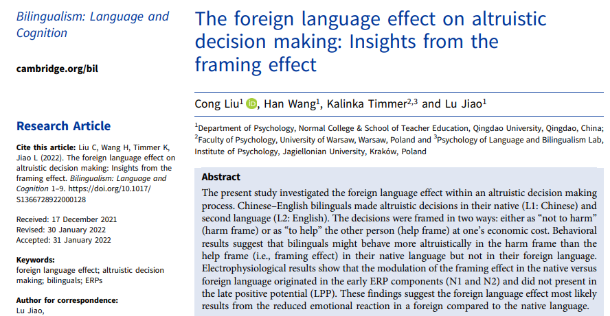 王涵在Bilingualism: Language and Cognition (SSCI Q1, IF = 3.532)发表题为《The foreign language effect on altruistic decision making: Insights from the framing effect》的研究论文,该研究利用脑电技术探讨了利他决策中的外语效应;孟娜在Neuropsychologia (SSCI Q2, IF = 3.139)发表题为《Partially shared neural mechanisms of language control and executive control in bilinguals: Meta-analytic comparisons of language and task switching studies》的研究论文,该研究利用脑成像ALE元分析探讨了双语者语言控制和执行控制神经基础的异同;段晓婷在Journal of Neurolinguistics (SSCI Q2, IF = 1.71)发表题为《Comprehension-based language switching between newly learned languages: The role of individual differences》的研究论文,该研究利用脑电技术探讨个体差异对新学语言间语言转换的影响。上述3项研究成果的指导教师为白菜网所有网站大全心理学系“脑与语言认知实验室”(https://www.jlclab.com/)的刘聪副教授、焦鲁副教授。