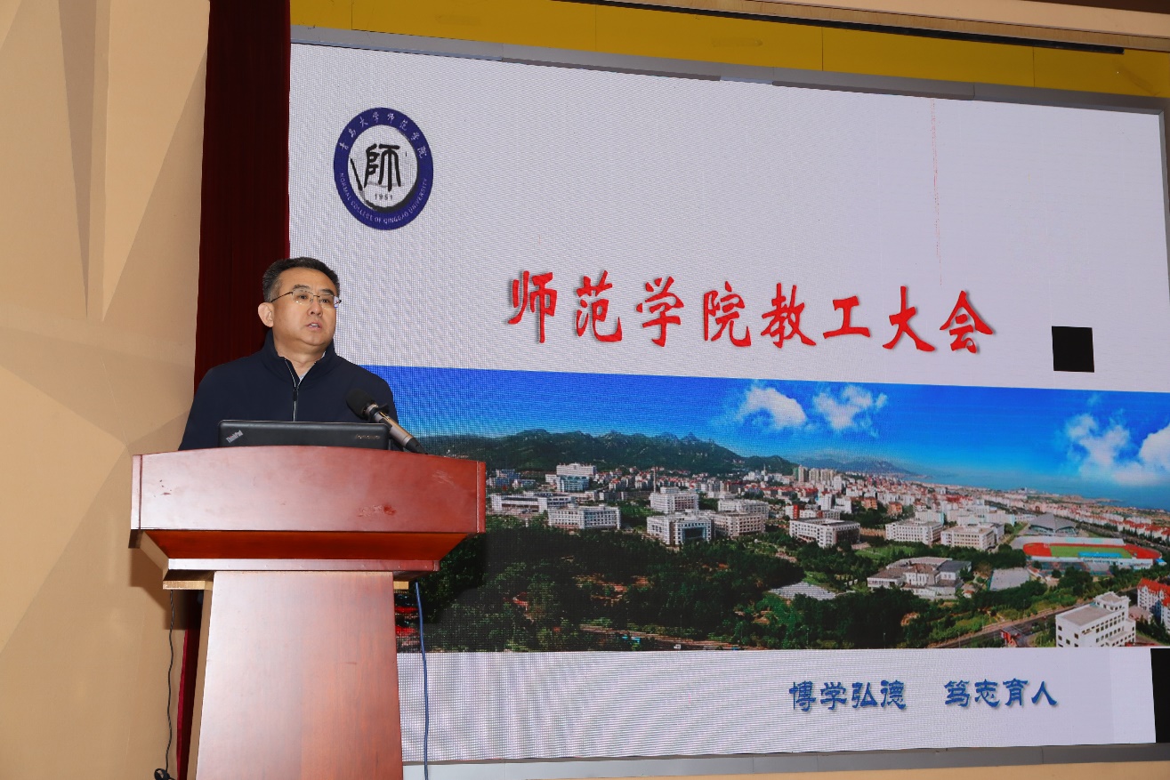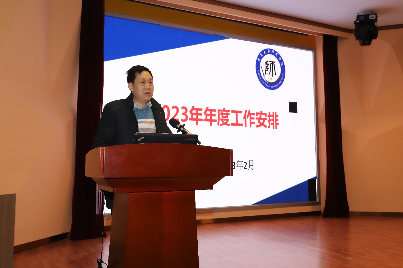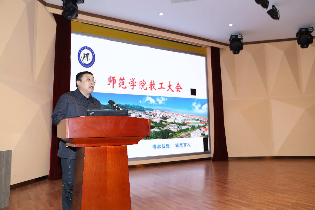 2月23日下午,师范学院在学术报告厅召开全体教职员工大会,传达学习学校春季学期中层干部研讨班、学校第六届教职工代表大会暨工会会员代表大会第五次会议(双代会)会议精神,布置2023年度学院重点工作。会议由副院长刘启民主持。