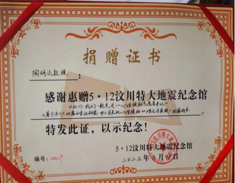 在“5.12”汶川特大地震发生15周年之际,由人民出版社近期刚刚出版的陶明达教授所著《中小学危机心理援助的理论与实践—基于汶川大地震的实证研究》一书在四川省绵阳市举行的“科技城人才峰会—第三届北川国际心理论坛”上发行,引起极大反响,这本基于汶川大地震的著作旋即受邀被“5.12”汶川特大地震纪念馆收藏,并于2023年5月13日在“5.12”汶川特大地震纪念馆举行了捐赠仪式,参加捐赠仪式的包括青岛啤酒公司、受援助北川学校的时任校长及教师代表、参加论坛的专家和学者。