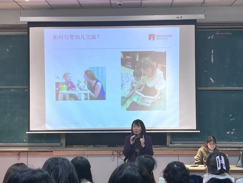 胡江波教授为大家带来了题为“如何与幼儿谈话交流”的讲座,并结合自身在中国与澳大利亚两国丰富的教学及研究经验展开讲述,提出了词组和词汇、功能、反应、谈话和语境这五个语言环境中的核心要素。辅以精彩的图文故事与视频案例对“平行描述性语言”和“心理状态语言”等关键概念进行解析,激发学生思考“如何与婴幼儿沟通交流”的重要性、类型方式、交流策略等内容,对于婴幼儿而言,大人的陪伴和语言交流足可以改变婴幼儿的一生。
