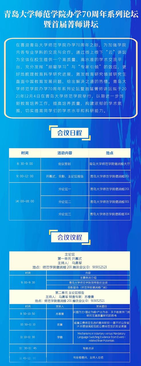 师范学院办学70周年系列论坛暨首届菁师讲坛即将在本周六(12月4日)召开,上午为开幕式及主论坛报告,下午为各分论坛报告。