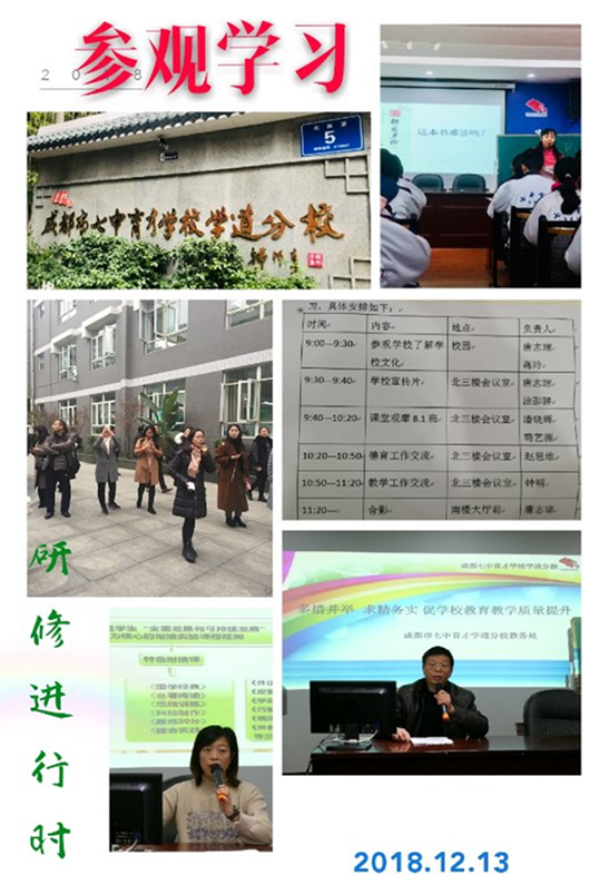上午,我们一行来到了成都七中育才学校学道分校。这是成都市一所为数不多的五四制初中学校。学校不大,但处处有风景、处处有教育。操场上随时可用的体育器材,走廊上在不影响别人的情况下可随意弹奏的钢琴,随处可见的各具特色的学科主题活动,无不彰显着学道人的人文素养。