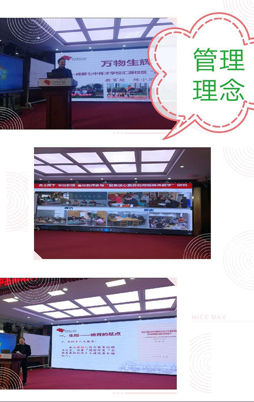 教育处陈小川主任则从学校德育的角度向参观团介绍了汇源校区德育课程品牌“万物生辉”。陈主任从德育的生根、发芽、生长三个角度为我们详细介绍了学校德育课程的设置,解读了“万物生辉”就是让每个学生都能在学习过程中焕发光彩,找到自己的闪光点,追求自己的人生梦想,做最好的自己。学校组织开展的一系列德育课程,让我们深刻感悟到一所名校的教育理念,一群教育家的教育情怀,一种卓尔不群,大器天下的教育追求。