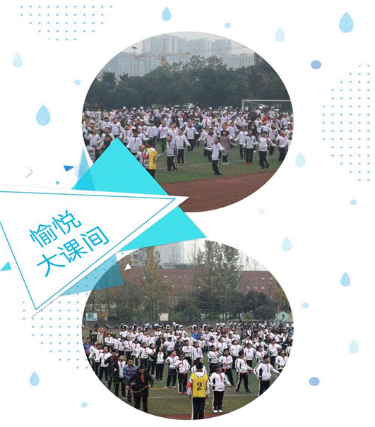 上午,我们慕名来到了四川初中教育的标杆----成都育才七中汇源校区。最先映入眼帘的是“卓尔不群,大器天下”的八字校训。走在环境优美的校园中,无时无刻不被它的大气的文化氛围所熏染。校园一角是师生共育的生物区和果园区,走廊上悬挂着学生精心创作的书画作品,每一个拐角处都设有读书角……最让人羡慕的是学校“阔气”的大操场——借着这一“地利”汇源校区形成了自己的体育特色。听陈小川主任介绍说大课间每周二、四做广播操,每周一、三跳自编绳操,保证了学生每天锻炼不少于1小时。